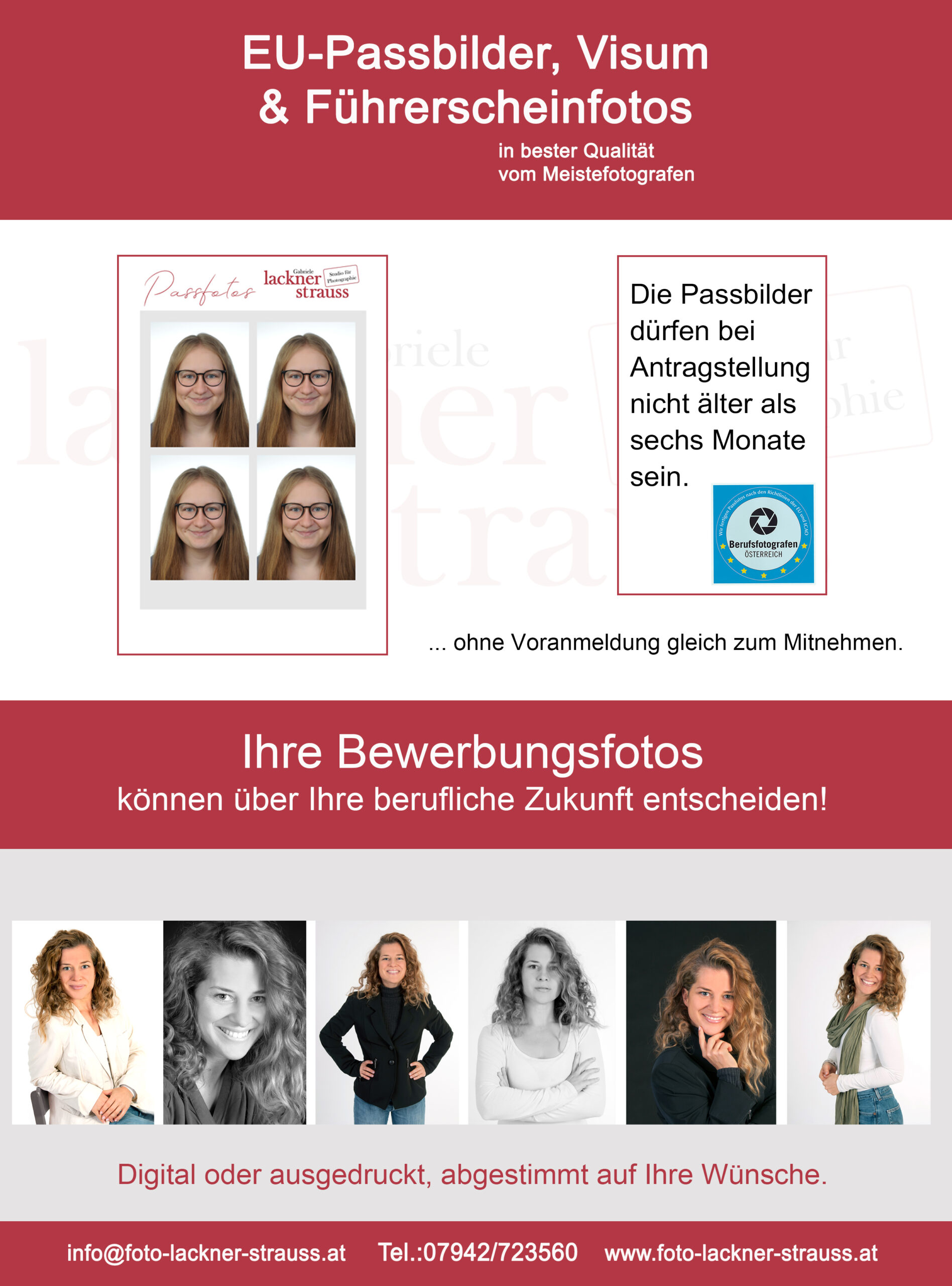 Unsere Leistungen als Berufs- und Meisterfotografen erstrecken sich unter anderem von Hochzeitsfotos, Familien-, Babybauch-, Newbornshootings, Portraits, Kindergarten- und Schulfotografie, Akte, Tier- und Werbefotografie über Reportagen. Natürlich können Sie bei uns auch professionelle Bewerbungsfotos, Businessfotos und Passbilder machen lassen.